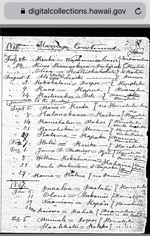 My ancestor 3xgreatgrandfather Kanohokai was a Mahiʻai who tended a loʻi at Kapena near Judd. I recently found his marriage record to Momona 3xgreatgrandmother and it listed their residence as Waikahalulu. Because of the proximity to his work, I assumed it was in the wailele area in Queen Liliʻuokalani Botanical Gardens near Nuʻuanu Stream. But now learning of these other traditional place names it makes me wonder because Momona’s known occupation was as a lei seller at the Honolulu Harbor. Their marriage is listed as September 21, 1866 and residence as Honolulu Wai ka Halulu.