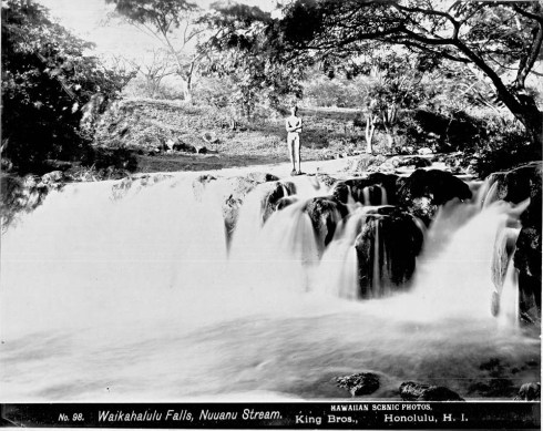 A visit to the tranquil Nu’uanu Stream park off School Street near Waikahalulu Lane will lend a peaceful and oft times trickling stream or two over a ten foot cascade, but this vintage photo depicts the low but wide waterfall in more of a roar befitting its name.